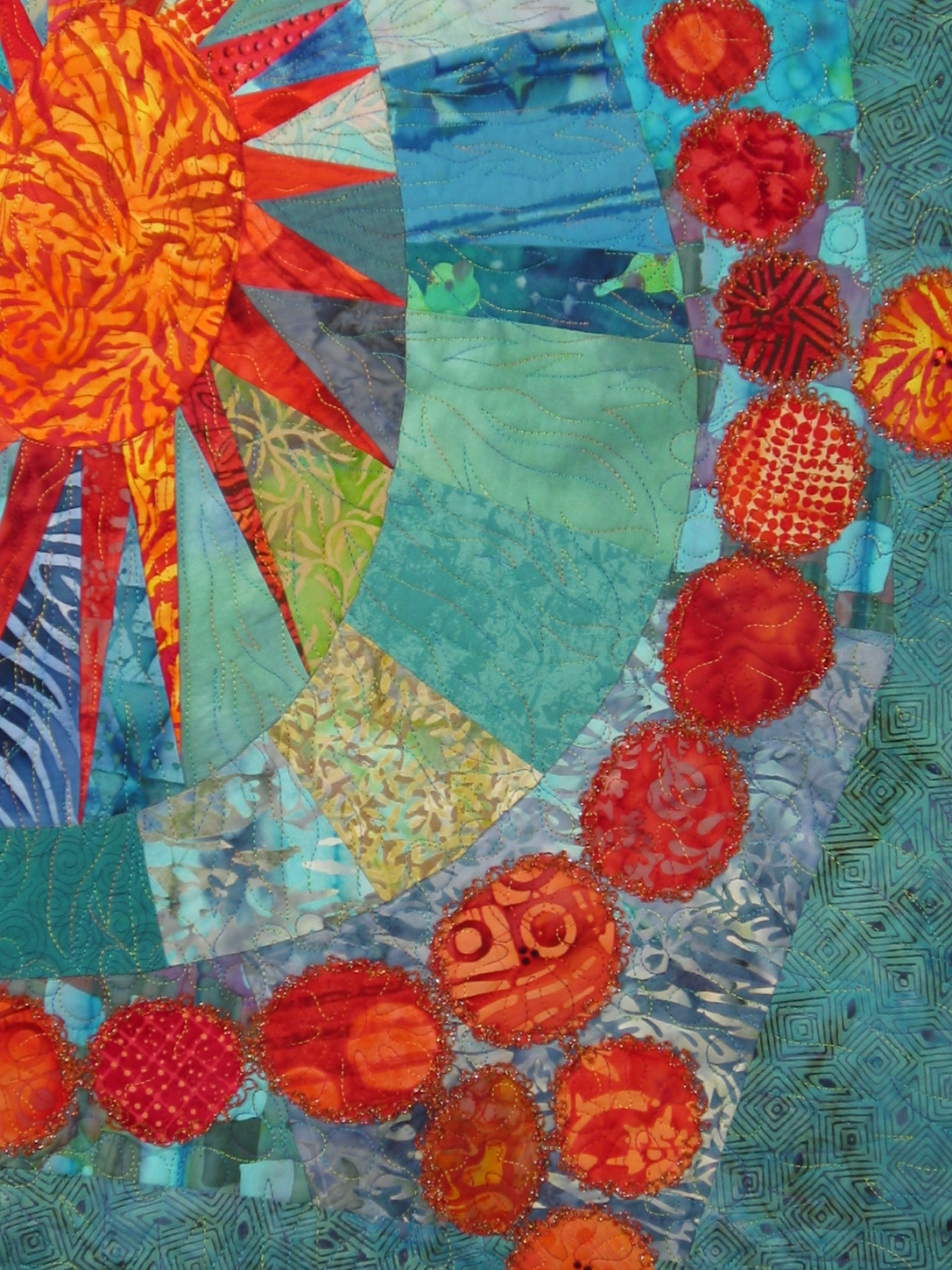 It may be a poem, a quotation, a prayer. The thoughts and feelings ignited by those words form mental images, which I sketch first on paper, and refine until I am satisfied with the design. The sketch becomes my working pattern, and I employ a wide variety of methods for creating the image in fabric, from traditional piecing and appliqué to raw edge applications. I frequently embellish my quilts with reverse bobbin embroidery and hand beading. I finish all my quilts with hand-guided quilting, using abstract, thematic motifs inspired by the words and images that first caught my attention. I enjoy sharing my interest in art quilts as an instructor and lecturer, and as the author of numerous articles for quilting and sewing magazines.