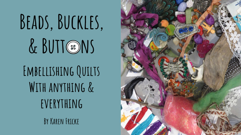I love to add embellishments to my quilts. This lecture includes a slide show of the ways I’ve used beads, as well as some rather unusual items, in my finished quilts. In a recent Quilting Arts Magazine article, I described using beetle carcasses to adorn my quilts. So when I say anything, and everything, I’m not joking! Includes information about the tips and tricks I’ve learned to add embellishments, as well as a show and tell of some of my favorite pieces.